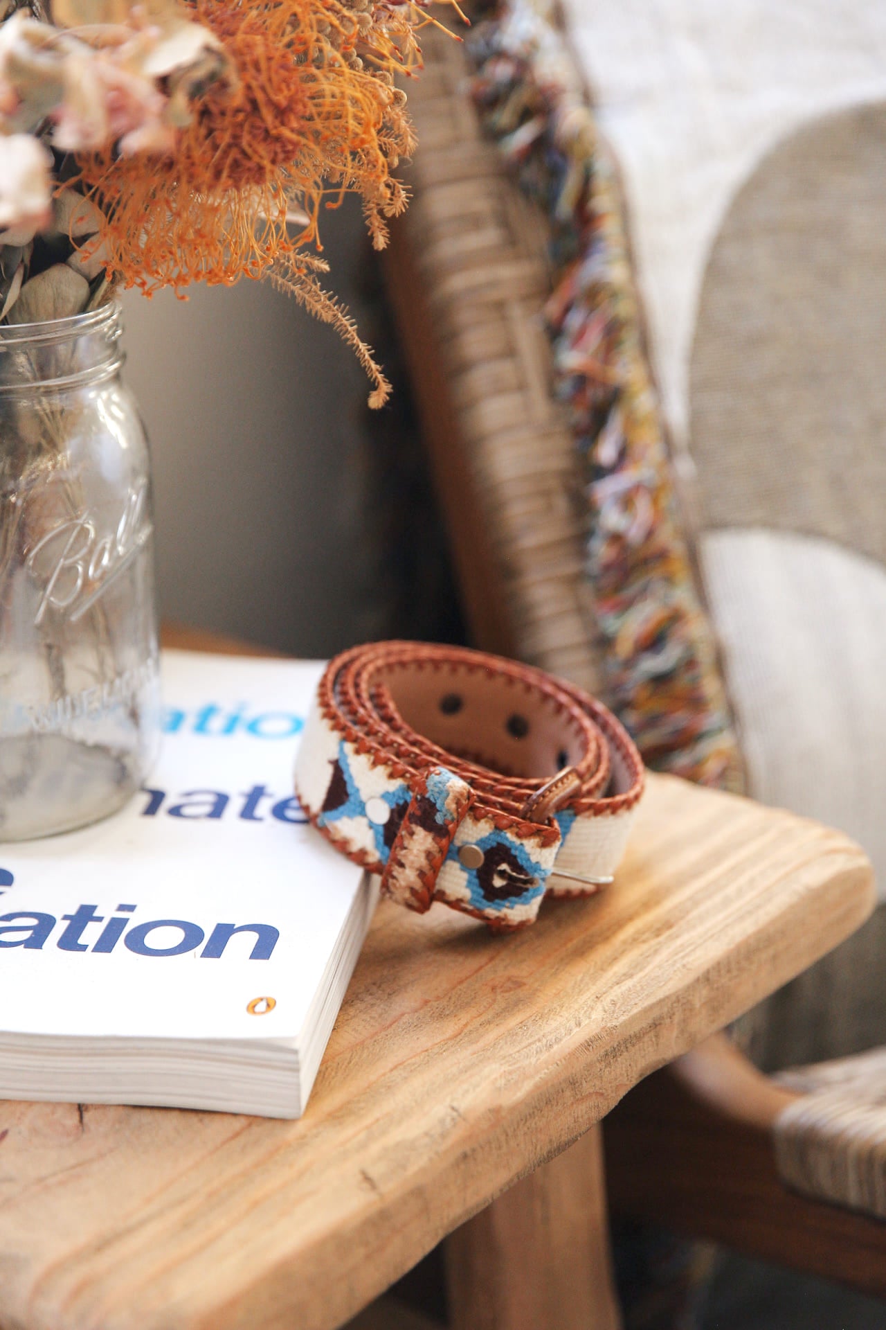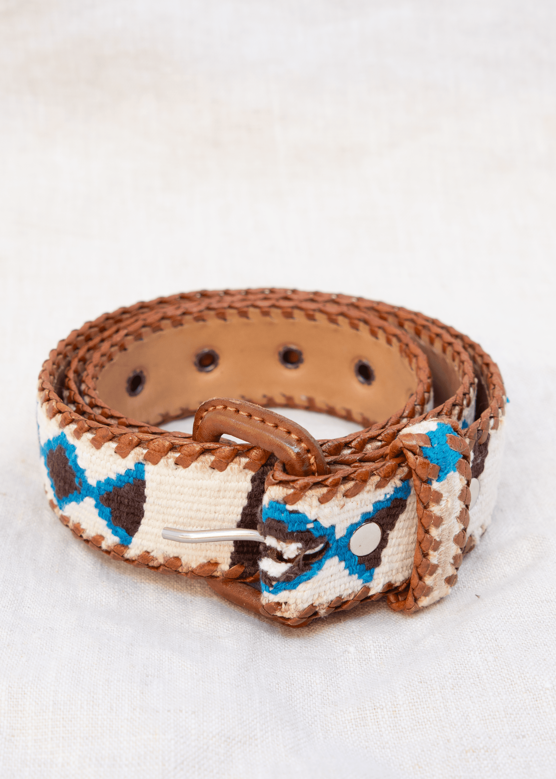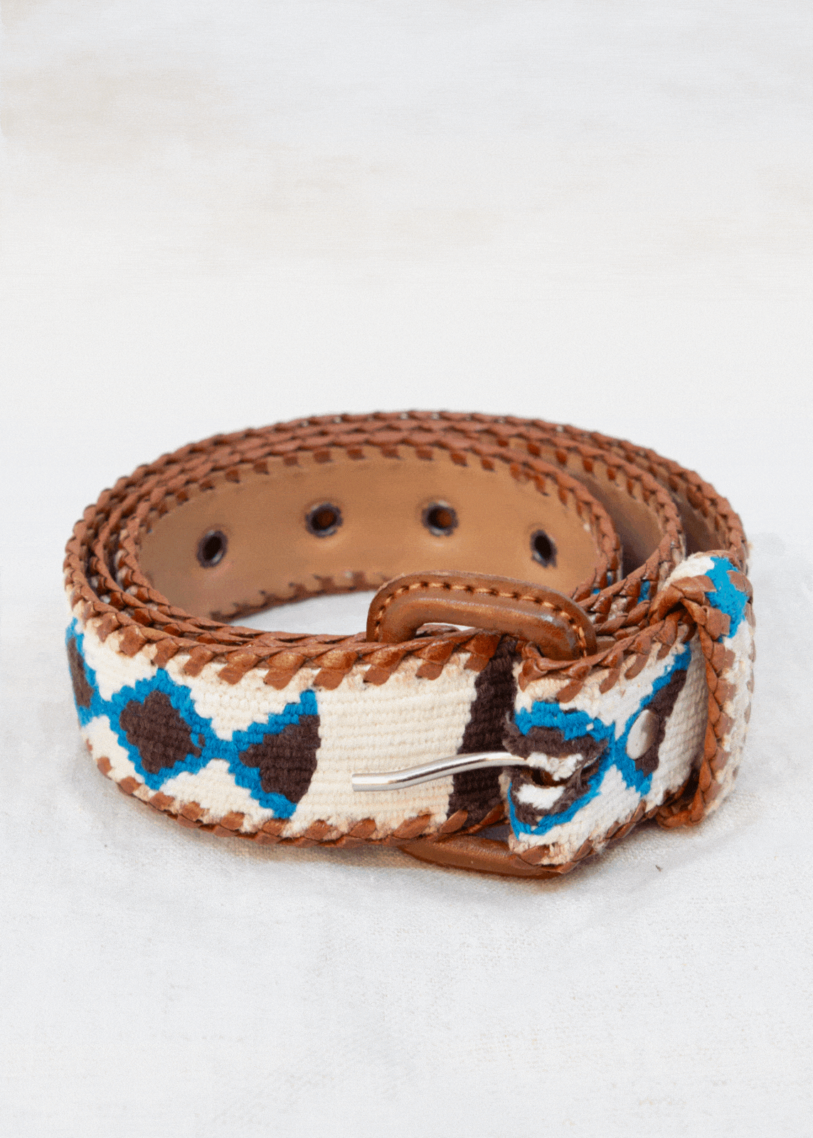 The belt’s palette of white, blue, and brown mirrors that balance. Crisp white and blue recall open skies and rushing energy, while brown grounds the design in earth and stone.