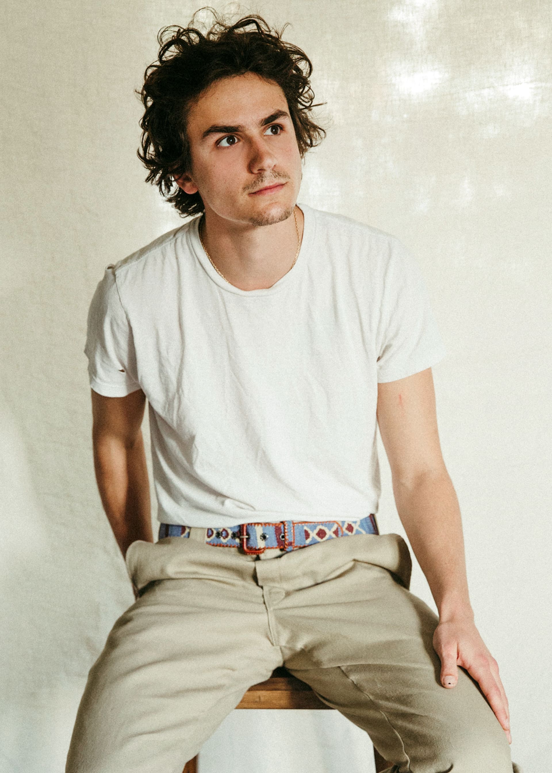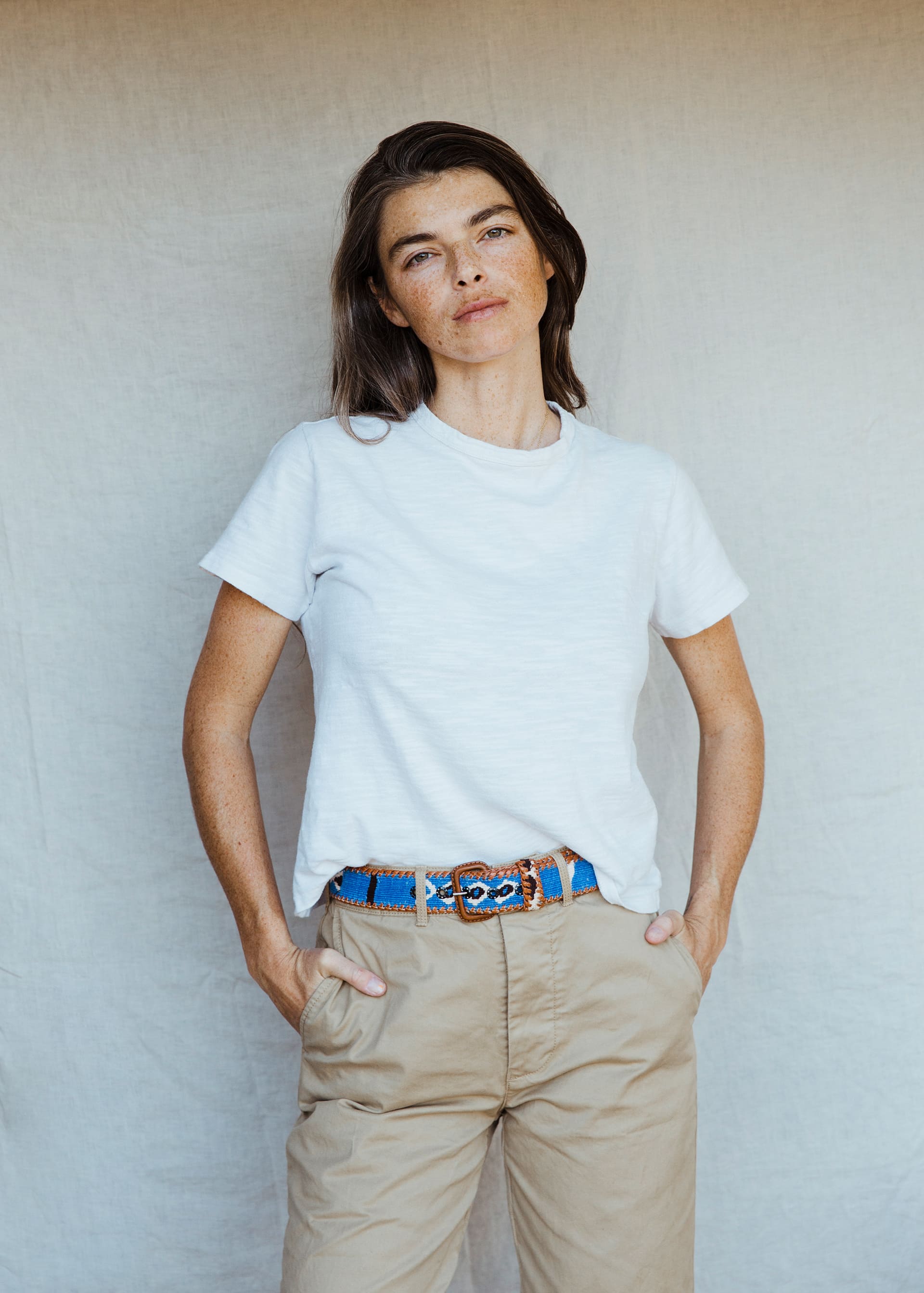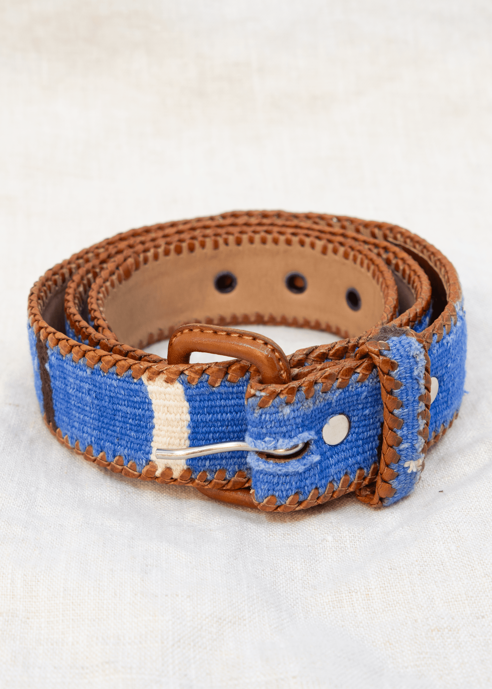 Cool blue embroidery set against crisp white captures the movement of rain across open skies. Crafted using time-honored weaving techniques and paired with premium vegetable-tanned leather, each belt carries subtle variations that make it truly one of a kind and grows more comfortable with wear.