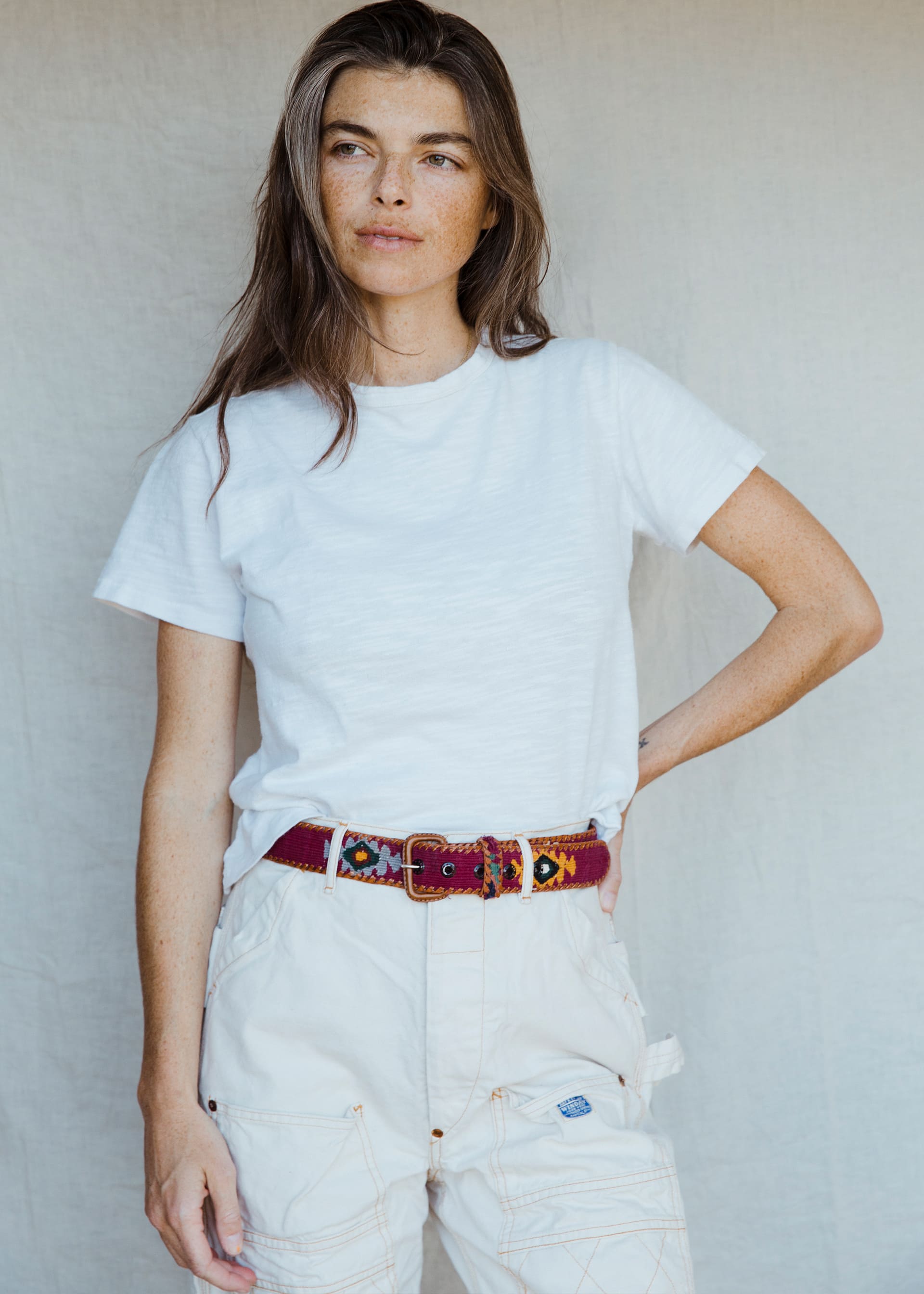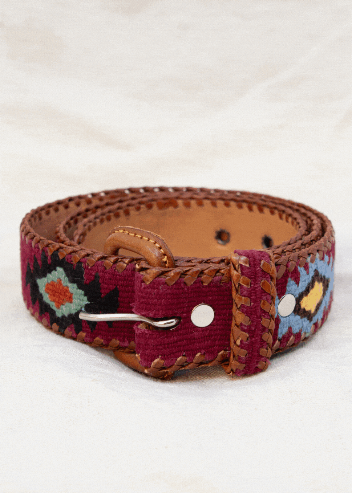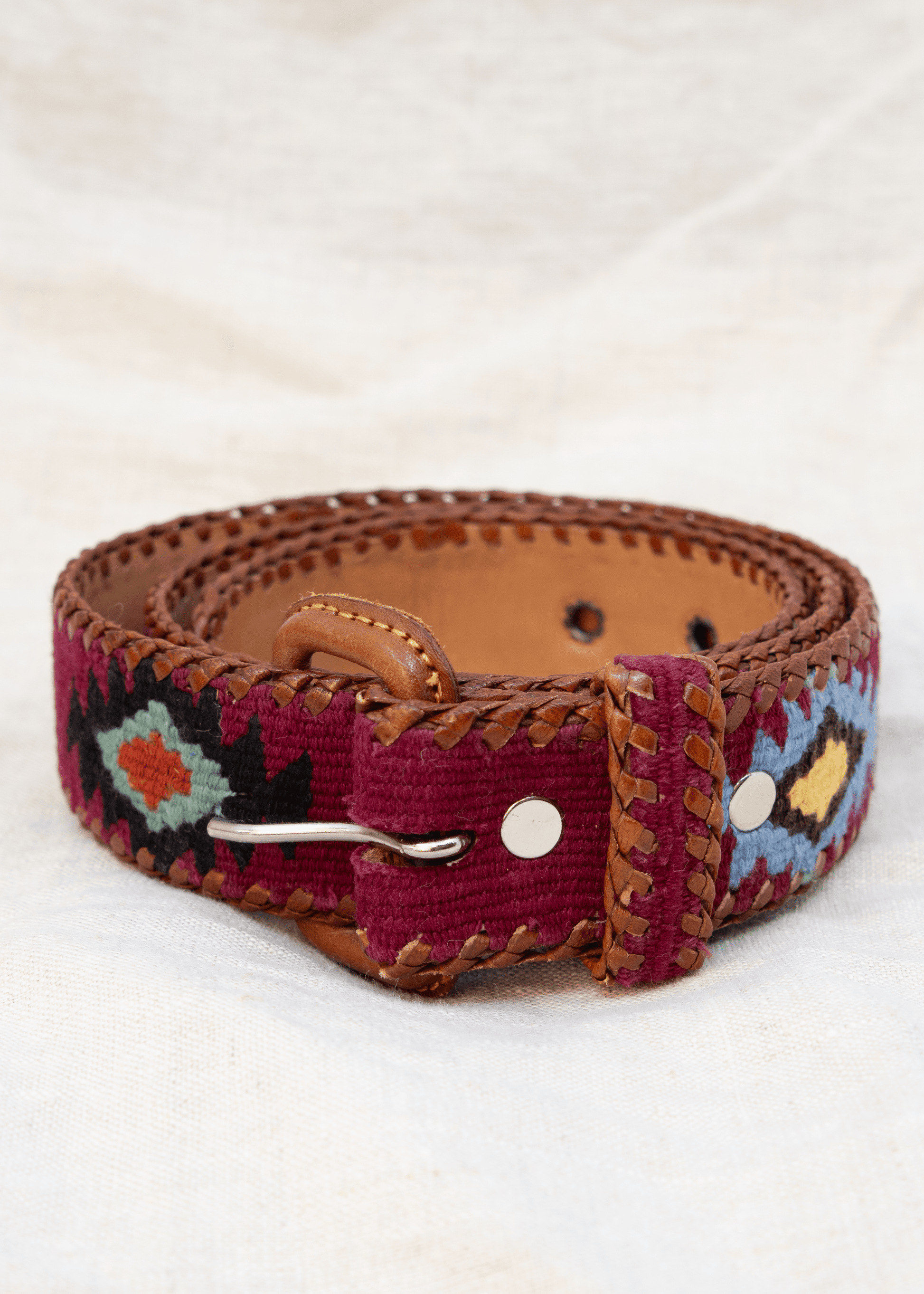 That legacy is reflected in a striking blend of burgundy, black, yellow, and turquoise. Deep, grounding tones are lifted by vibrant accents, mirroring the balance between shadow and light. Handwoven on a traditional Guatemalan backstrap loom and finished with premium vegetable-tanned leather, each piece is unique and designed to mold comfortably to your waist over time.